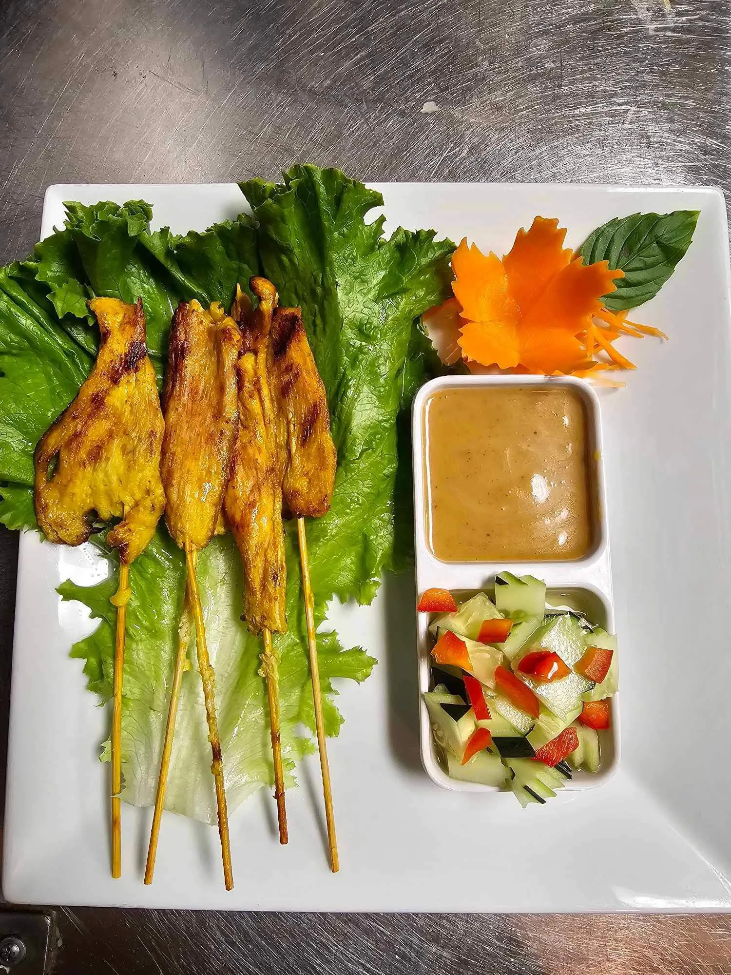 Grilled Chicken Skewers Marinated Thai Seasonings. Served With Peanut Sauce.