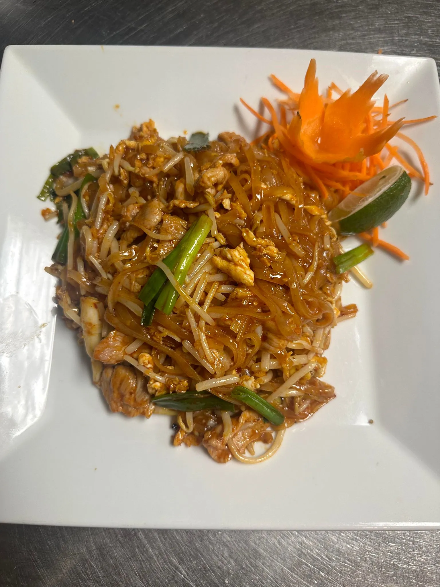 Slightly Pan-Fried Soft Flat Noodle With Egg, Beansprouts, And Chicken.