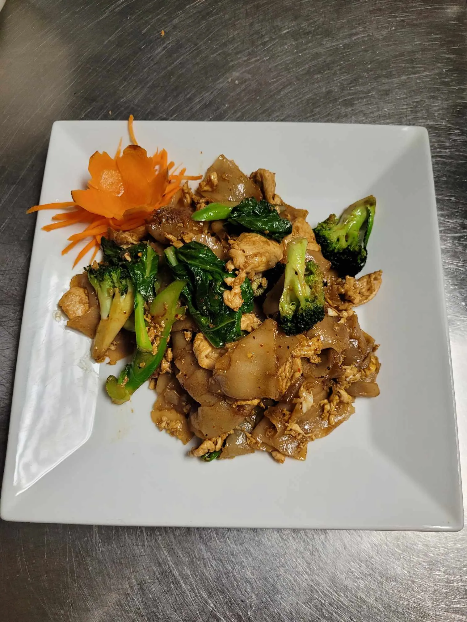 Slightly Pan-Fried Soft Flat Noodle With Egg, Fried With Chinese Broccoli, And Topped With Thai Gravy Sauce.